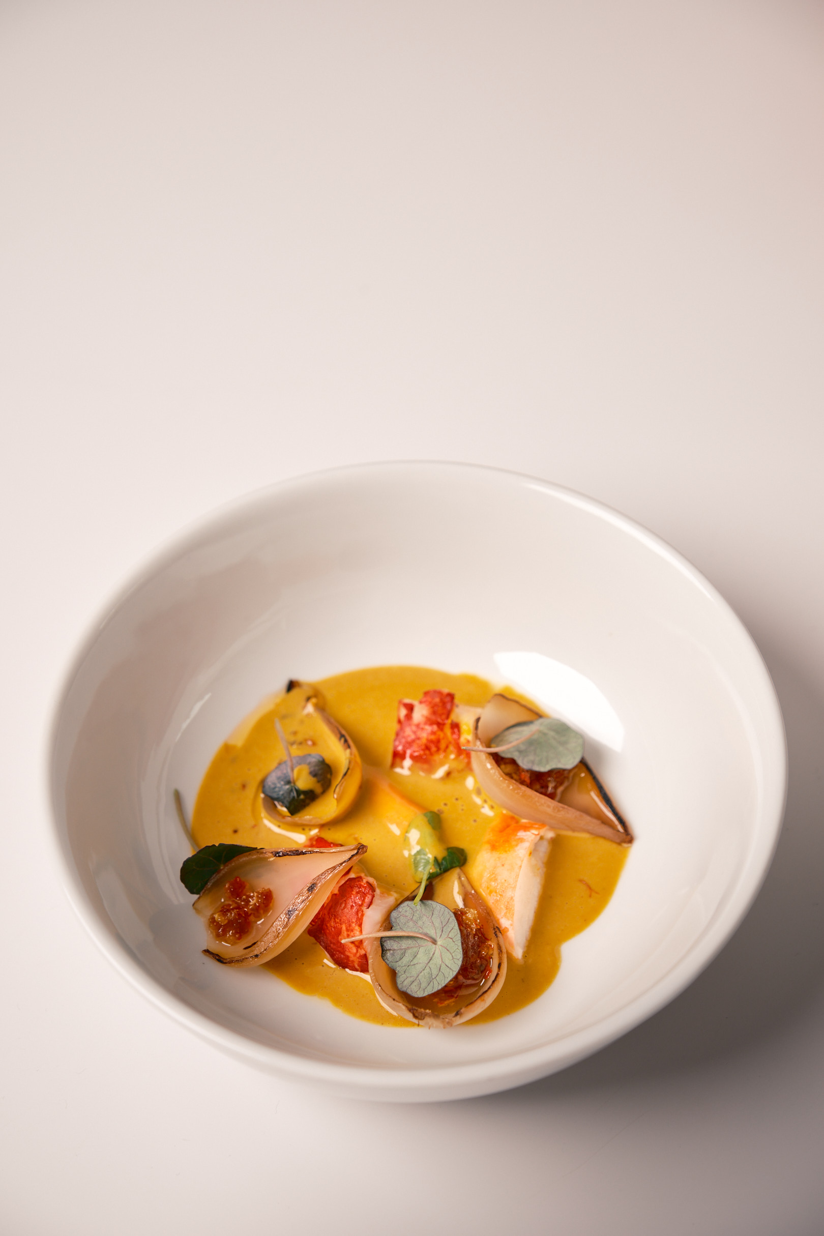 Dansk sort hummer med Roscoff løg, safran og hummerbisque.