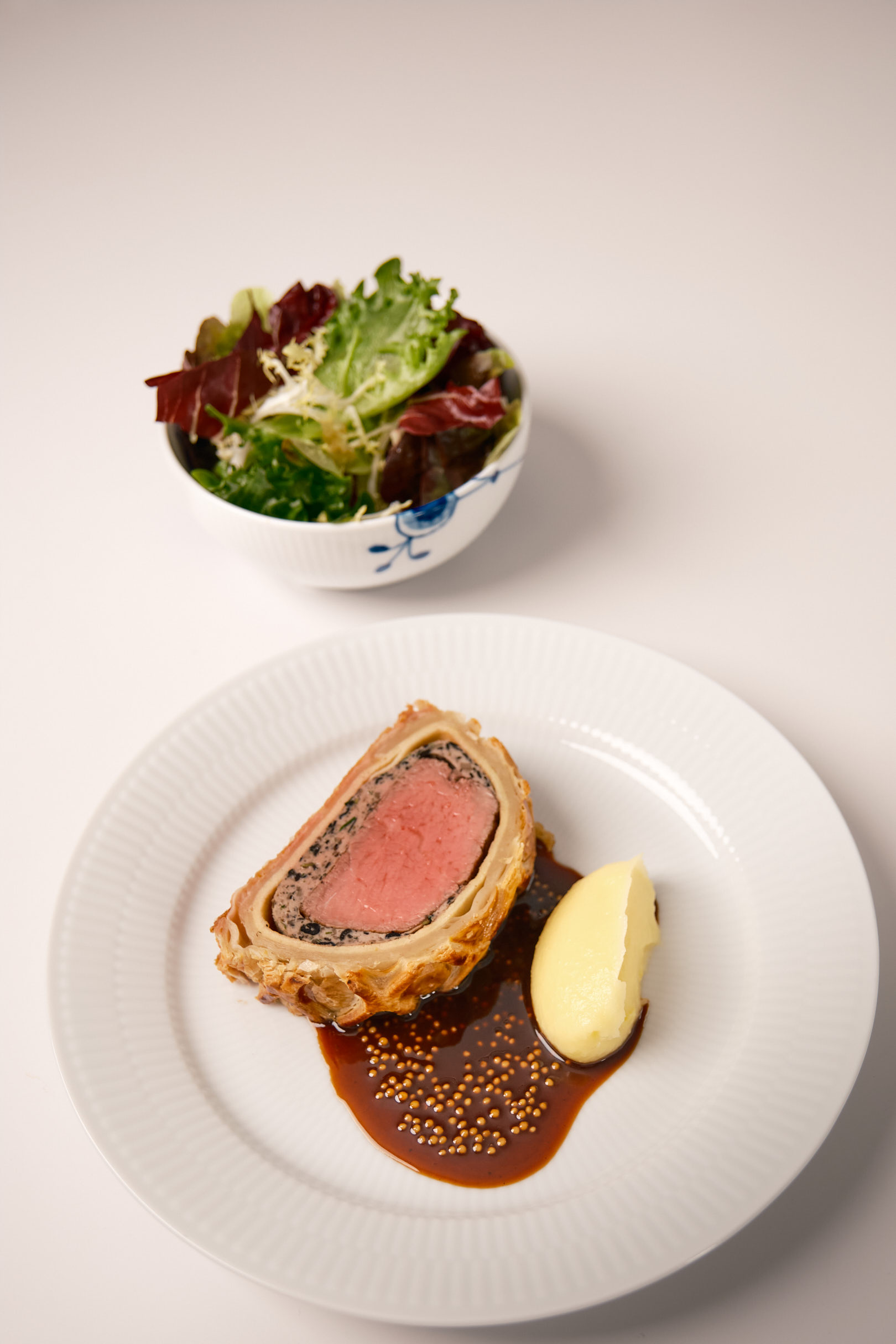 • Klassisk: Beef Wellington med oksemørbrad og svampe. Serveret med kartoffelpuré, rødvinssauce og sprød marineret salat.