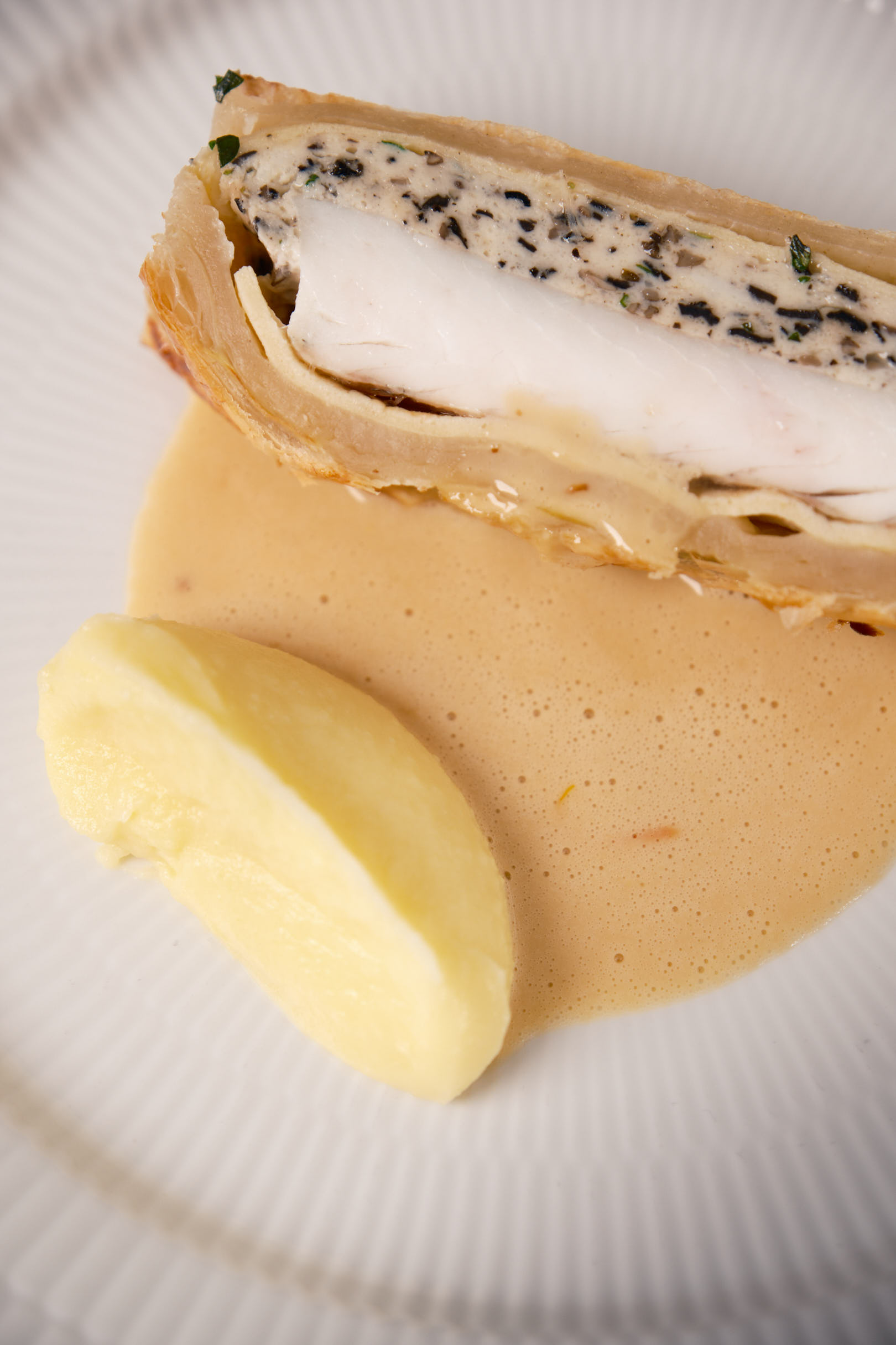 Serveret med kartoffelpuré, pighvarfumé og sprød marineret salat.
